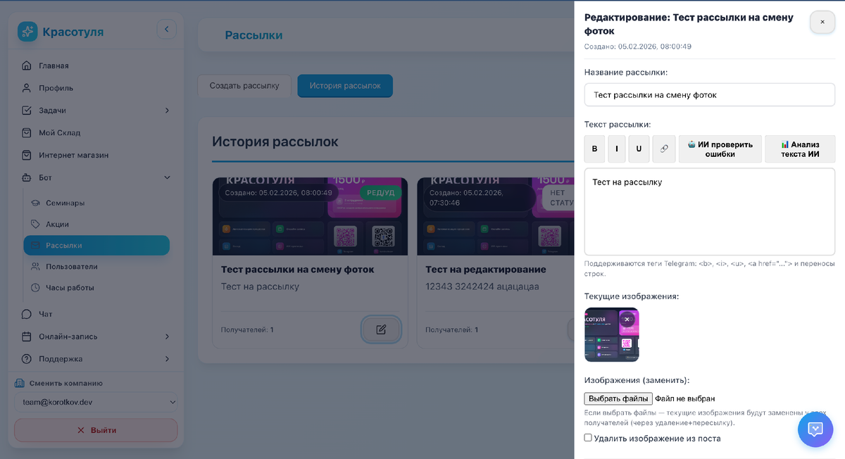 На связи Геннадий Коротков, руководитель команды KorDev Team! Добавил фичу по редактирование УЖЕ отправленной рассылки клиентам. Теперь можно: 1.Редактировать уже отправленные рассылки, в том числе изменять фото. 2.Удалять рассылку у всех адресатов. Телеграм канал: https://t.me/krasatulaCRM Сайт: https://krasotula.com/