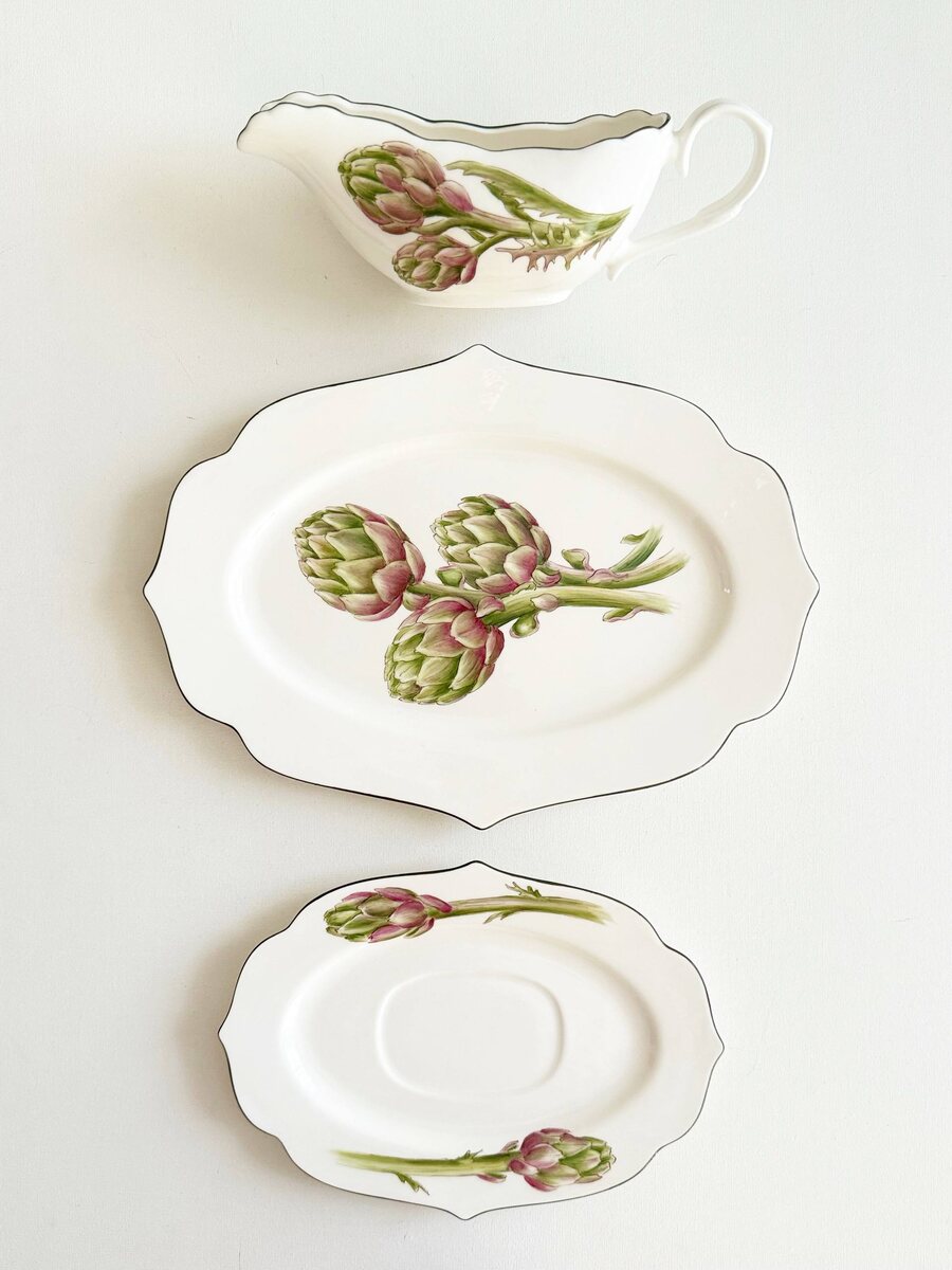 Тема росписи - соцветия артишока, одновременно гастрономическая (кулинарная) и дизайнерская. Артишок – не только изысканный деликатес. Формы растения используются в интерьерном дизайне для создания арт-объектов, например, знаменитые светильники-артишоки... Эта роспись - ботаническая, то есть растения изображены, как с натуры, как они есть в живой природе. Набор посуды расписан на заказ. Включает два изящных по форме овальных блюда (фарфор) и не менее изящный соусник. Ручная роспись надглазурными красками, многократный обжиг в муфельной печи при 800С. При обжиге образуется единый сплав глазури и красок, поэтому рисунок на тарелках нестираемый. Можно мыть в посудомоечной машине, использовать в свч. Большое блюдо - 30х21,5 см, Соусник - объем 330 мл, Блюдце - 22,5х15,5см. Стоимость этого набора - 22 тыс. руб. Под заказ можно расписать любое количество и тип предметов. Различные наборы, чайные и столовые сервизы. Тема росписи - тоже на выбор. Что в моих творческих возможностях, с удоволь