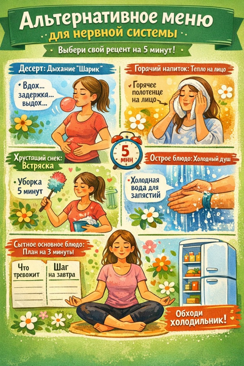 » 🧘♀️ Вас тянет к еде от стресса? Вот ваше новое «меню» на 5 минут! Мы поняли, что вечером нам часто нужна не еда, а разрядка для нервной системы. 🥺Мозг кричит: «Немедленно дай мне дофамин (гормон удовольствия) и снизь кортизол (гормон стресса)!». ‼️Холодильник — это быстрый, но обманчивый путь. Предлагаю вам новое, альтернативное «меню». Каждый «рецепт» занимает 5-10 минут и работает в разы эффективнее чипсов или сладкого. 👀Вот ваша карта выбора. Сохраните себе! ⭐️ 1️⃣ «Десерт»: Дыхание «Шарик» 🎈 Что делать: Сядьте удобно. Закройте глаза. Медленно вдохните через нос на 4 счёта, представляя, как в животе надувается воздушный шарик. Задержите дыхание на 4 счёта. Медленно выдохните через рот на 6-8 счетов, как будто сдуваете шарик. Эффект: Мгновенно снижает пульс, переключает нервную систему с «тревоги» на «покой». 2️⃣ «Горячий напиток»: Тепло на лицо ☕️ Что делать: Намочите полотенце в горячей (комфортной) воде, отожмите и накройте им лицо на 1-2 минуты. Сосредоточьтесь на ощ