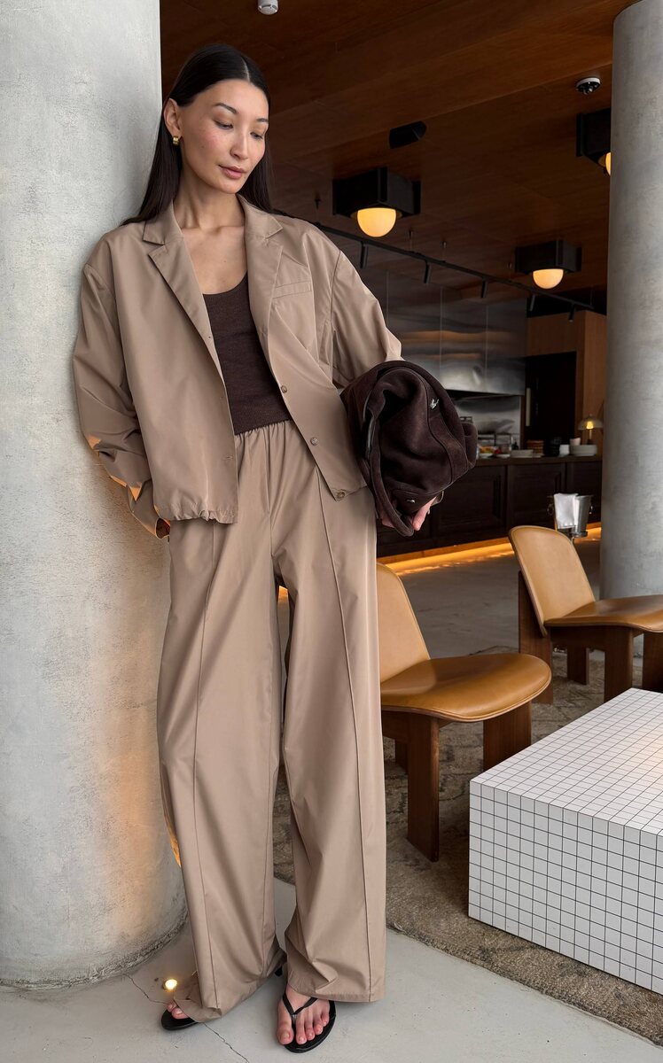 Сшит из гладкого и шелковистого материала — комплект не мнется и не прилипает к телу, отталкивает легкие осадки и подойдет для непредсказуемой погоды. Рубашка напоминает бомбер — силуэт регулируется с помощью стопперов и кулиски. Ее удобно носить нараспашку: все швы с изнанки аккуратно закрыты кантом. Брюки с имитацией стрелок визуально увеличивают рост, а с помощью потайных молний можно сделать разрезы почти до колена. Все изделия ждут вас на сайте, в приложении и магазинах 12 STOREEZ 🤍12 STOREEZ