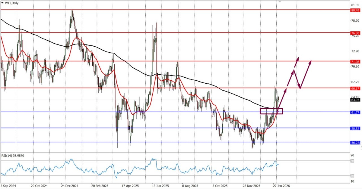 После роста в среду, сегодня цены на нефть WTI корректируются вниз до уровня 63.85 на фоне того, что США и Иран согласовали переговоры, однако тренд остается восходящим. Цены на нефть в четверг снизились примерно на 2% на фоне сообщений о договорённости США и Ирана провести переговоры в пятницу, 6 февраля, в Омане, что ослабило опасения инвесторов относительно возможного военного конфликта и его влияния на поставки нефти из ключевого региона Ближнего Востока. Однако стороны по-прежнему сильно расходятся во мнениях относительно того, что должны включать переговоры. Иран открыт для обсуждения с западными странами своей ядерной программы, включая обогащение урана, в то время как США также хотят включить в обсуждение баллистические ракеты Ирана, его поддержку вооруженных группировок на Ближнем Востоке и отношение к собственному народу. Вполне вероятно, что эти переговоры выявят новые разногласия, и премия за риск вскоре снова возрастет. Долгосрочный тренд по нефти сменился на восходящий