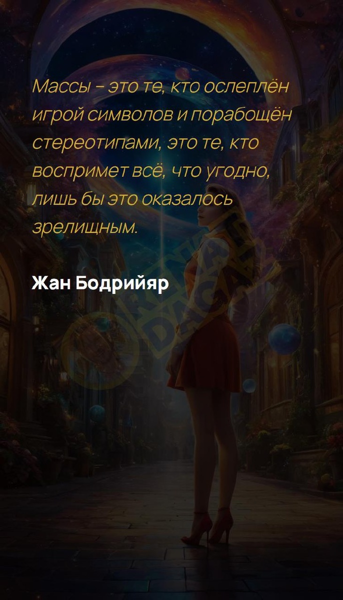 Массы – это те, кто ослеплён игрой символов и порабощён стереотипами, это те, кто воспримет всё, что угодно, лишь бы это оказалось зрелищным. Жан Бодрийяр Архитектура вашей души | Архитектура вашей души T | VK | Pin | YouTub | Dzen #вдохновение #моицели #изменениесудьбы #встреча #здоровье #квантовыйскачок #советдня #радость #новоесознание #5число #5февраля
