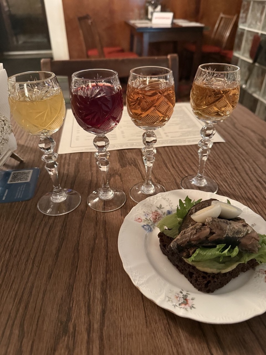 Случайно зашёл в бар на Каменноостровском проспекте, 14, в поисках Wi-Fi перед квизом - и остался под впечатлением. Заведение называется "Рюмочная-Пельменная Синичка", хотя на вывеске красуется "Синяя птица" - небольшая загадка для посетителей. Рейтинг 5.0 звёзд и 2204 отзыва на Яндекс Картах говорят сами за себя. Интерьер выполнен в стилистике советской коммуналки с невероятным вниманием к деталям. Хрустальные рюмки на длинной ножке, винтажная мебель, живые цветы, хрустальная люстра и легендарный проигрыватель УРАЛ-112 - всё это создаёт атмосферу ностальгии. Зал небольшой, места часто заняты, поэтому столик лучше бронировать заранее. Выбор настоек не огромный, но каждая заслуживает внимания - никакой попсы, только авторские рецепты. Мои фавориты: Все крепенькие, но очень вкусные. Приятная фишка - можно заказать графин любой настойки, что удобно для компании. Гастрономия полностью соответствует концепции: от простых пирожков с капустой и яйцом до пельменей и Кологривского сыровялено