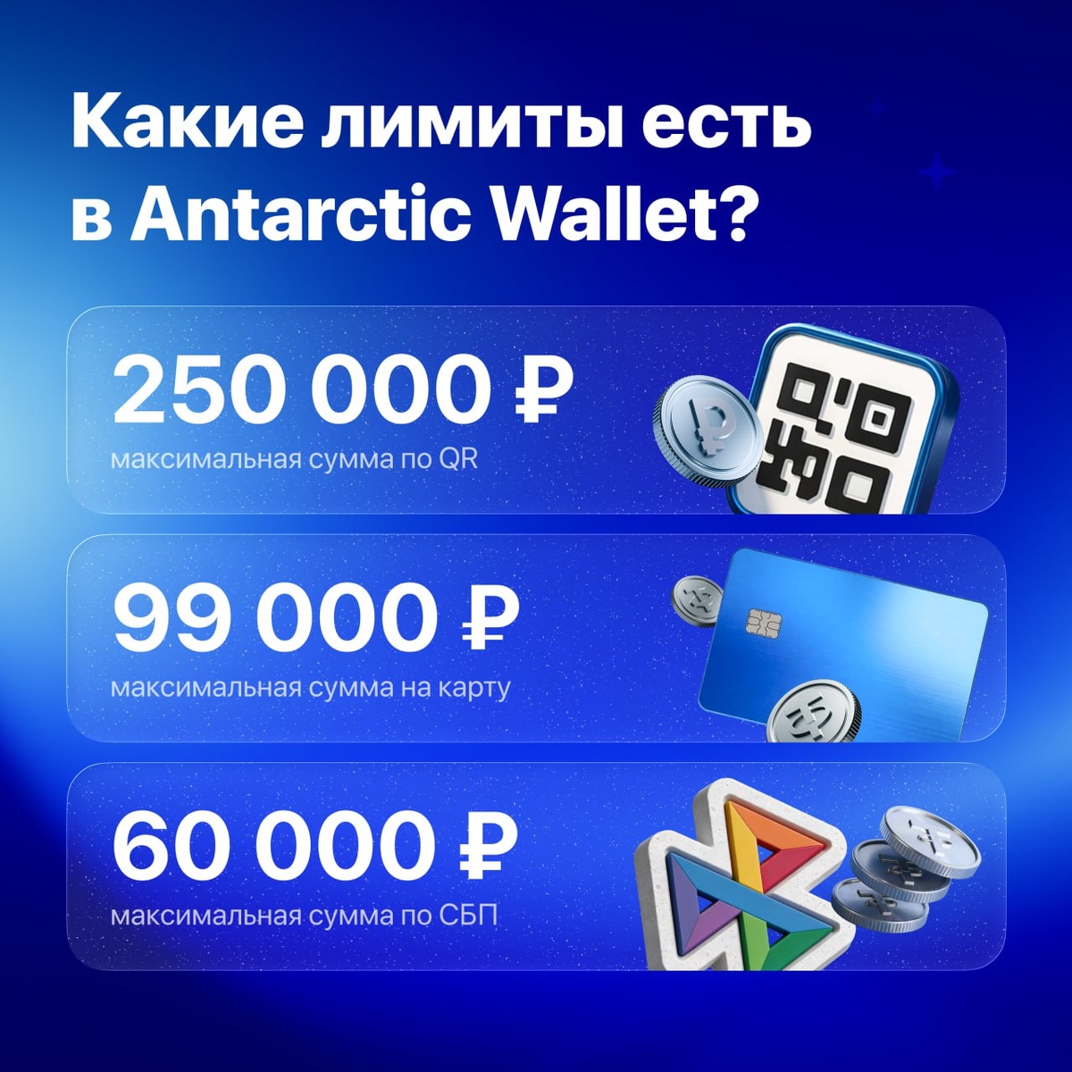 Antarctic Wallet — инновационный криптокошелёк, с которым вы сможете обменивать криптовалюту на товар в магазине, не используя банковские карты и обменники. Лимиты существуют не просто так. Они помогают обеспечивать вашу безопасность и корректную работу со стороны банковской инфраструктуры. ➖ Оплата покупок по QR-коду: до 250 000₽; ➖ Обмен USDT на Рубли по номеру карты: до 99 000₽; ➖ Обмен USDT на Рубли по СБП: до 60 000₽; ➖ Своп USDT⇄TON: до 2500 USDT; ➖ Своп TON⇄USDT: до 400 TON. *лимиты указаны за одну транзакцию. Для оплаты по QR через $TON – минимальная сумма покупки должна быть больше 1 $TON. #AntarctikWallet 🌟Навигация /💬Чат /📈Биржи