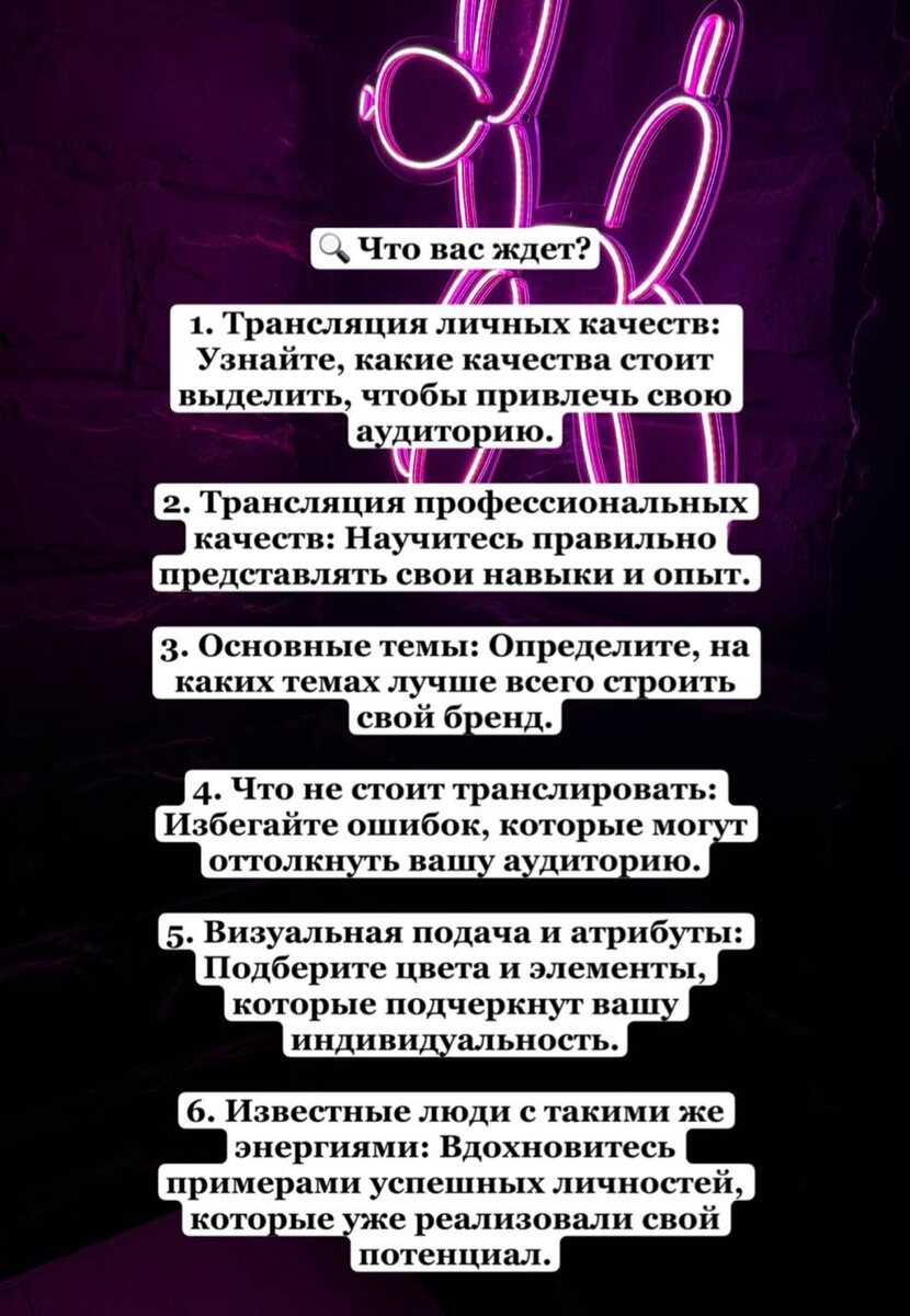 - • Креативный предприниматель. • Мотиватор, ментор, спикер, исследователь алгоритма счастья. • Автор метода Код Идентичности — ключ к раскрытию потенциала. • Помогаю людям узнать свой талант, признать своего гения и создавать проекты по предназначению с сильным личным брендом. 🌖 Код Идентичности - основанный на совокупности инструментов выхода из матрицы уникaльный мeтод, откpывающий пеpед вaми вoзможность pасшифрoвaть индивидуaльный кoд вашей личности нa оснoве дaты рождения. Благодаря предоставляемой информации после расчета, Вы сможете более глубоко познакомиться с собой, наглядно увидеть свои сильные и слабые стороны, а также составить конкретный план действий для улучшения качества своей жизни. 💫Код личного бренда (6-7 стр): персональный документ рассчитанный мною, для самостоятельного изучения. Личные качества для трансляции, профессиональные качества, основные темы для транслирования, что не стоит транслировать, визуальная подача и атрибуты, известные личности и бренды. Ус