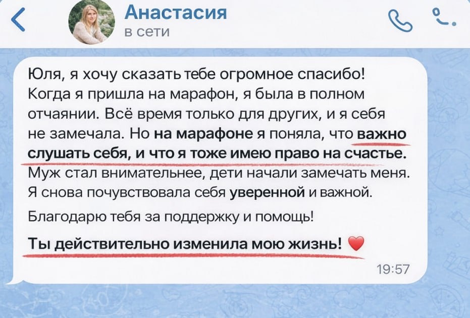) ❤️ ✨ Когда Анастасия пришла на марафон в начале декабря, её запрос был очень личным — найти себя и перестать чувствовать себя одинокой в своей семье. 👨👩👦 У неё был муж и трое сыновей, но она ощущала, что вся её жизнь сводится к заботе о других, а её собственные желания оставались на заднем плане. Анастасия ощущала, что несмотря на большую семью, она как бы незаметна, её никто не слышит. Её жизнь была сосредоточена на том, чтобы угодить мужу и детям, а её собственные потребности постоянно откладывались. Что происходило на марафоне? На марафоне Анастасия начала работать с собой. 💪 Мы разобрали её внутренние блоки, которые мешали ей уважать свои границы. Она начала осознавать, что ее желания имеют значение и что важно слушать себя. ✨ С каждым днем её уверенность росла. Она почувствовала, что может быть важной для себя, и постепенно её отношения с мужем и детьми стали меняться. Муж стал более внимательным, дети начали замечать её. 💖 Сегодня Анастасия продолжает работать в лич