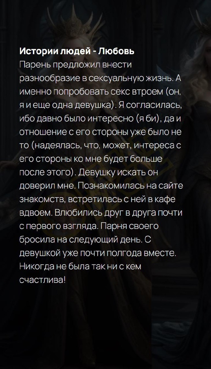 Истории людей - Любовь Парень предложил внести разнообразие в сексуальную жизнь. А именно попробовать секс втроем (он, я и еще одна девушка). Я согласилась, ибо давно было интересно (я би), да и отношение с его стороны уже было не то (надеялась, что, может, интереса с его стороны ко мне будет больше после этого). Девушку искать он доверил мне. Познакомилась на сайте знакомств, встретилась с ней в кафе вдвоем. Влюбились друг в друга почти с первого взгляда. Парня своего бросила на следующий день. С девушкой уже почти полгода вместе. Никогда не была так ни с кем счастлива! #бабушкиидедушки #хорошеенастроение #светвнутри #поступки #добромиру #тренды #доброепоколение #удача #взаимовыручка #бабушкиидедушки #хорошеенастроение #светвнутри #поступки #добромиру #тренды #доброепоколение #удача #взаимовыручка Архитектура вашей души | Натальная карта T | VK | Pin | YouTub | Dzen Истории людей - Любовь Парень предложил внести разнообра… #5число #5февраля