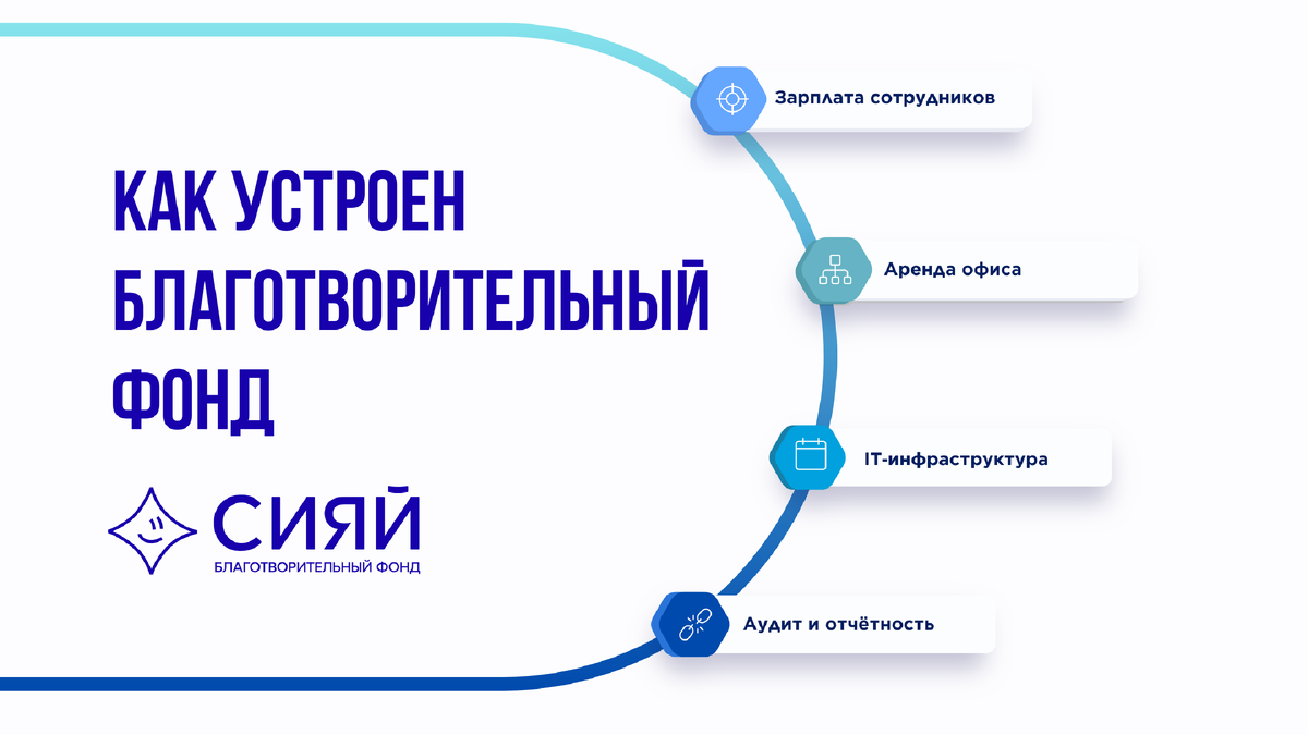 Это «сердце» фонда — средства, которые идут напрямую на помощь подопечным: o оплата лечения и реабилитации; o закупка оборудования и расходных материалов; o организация обучения и мастер‑классов; o поддержка спортивных и творческих проектов; o выплаты стипендий и грантов. 2. Административные расходы (10–20 %)