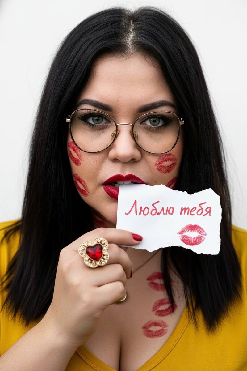 ♥️ Сохраняй себе в закладки 🔁 Промт: Фотореалистичный портрет крупным планом, кинематографический вспышка Y2K. Чистый белый фон, драматическое профессиональное верхнее освещение с глубиной и скульптурными тенями. Голова прямо, камера крупным планом на уровне глаз, острый взгляд, томный, томный взгляд. Графичный «лисьий глаз» только во внешних уголках глаз, подчеркнутые ресницы, насыщенная красная помада с более темным контуром. Она кусает зубами грубо разорванный клочок бумаги, держа его за уголок; на бумаге красной помадой написаны слова «Люблю тебя» и виден отпечаток поцелуя. Хаотичные следы поцелуев от красной помады на лице, шее, плечах. Золотое кольцо с большим красным сердцем и бриллиантом. Не изменяй черты лица. На листе бумаги написано "Люблю тебя" Фото можно сделать тут ➡️ https://t.me/gptcyber_bot?start=ref_205e2faa37