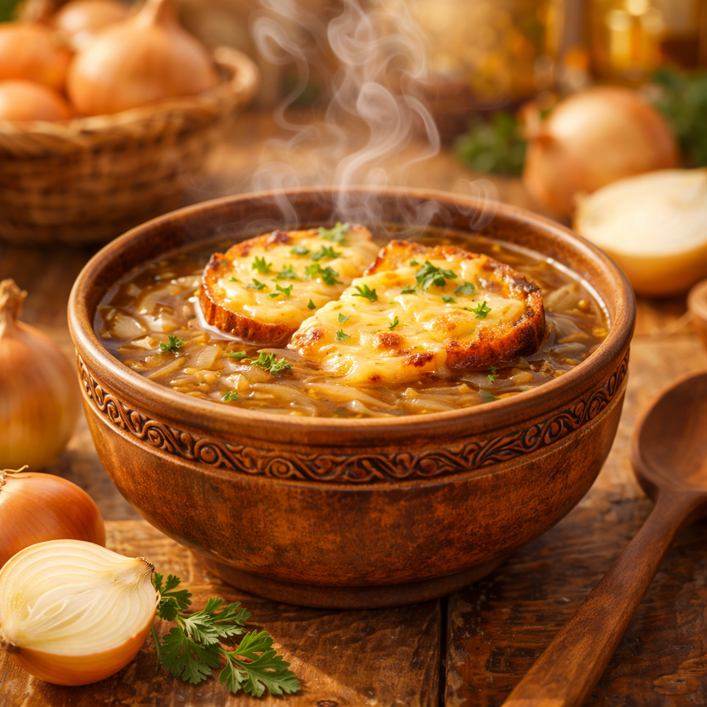 - В порционные формы наливаем суп. Сверху накрываем гренками и посыпаем сыром. Отправляем в духовку на 10 минут при 200 гр, чтобы сыр расплавился и зарумянился✨