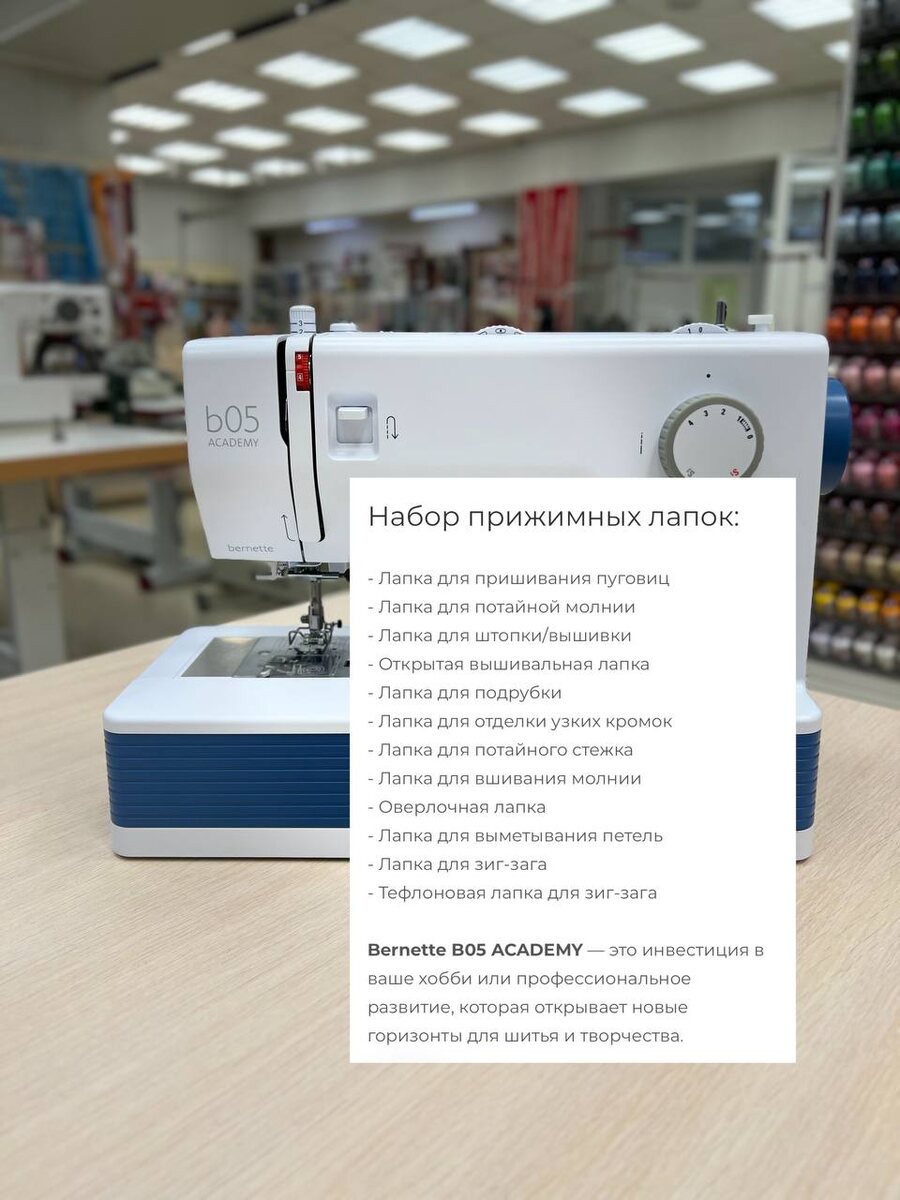 Отличные варианты в сегменте до 40 000 ₽: надёжные, простые в управлении, с широким набором функций и хорошей комплектацией. Особенности: - В комплекте — целых 12 лапок и приставной столик. (6 лапок и столик докупается отдельно) - Есть защитный ограничитель от попадания рук под иглу — удобно и безопасно для новичков. - Регулировка прижима лапки, позиционирование иглы, горизонтальный челнок. - 30 швейных операций, включая автоматическую петлю. 🌟Специальное предложение: - Bernette b05 Academy — 39 900 ₽ (вместо 49 900 ₽) - Скидка на соседнюю модель: Bernette b05 Crafter — 34 900 ₽ (вместо 44 900 ₽) Дополнительные преимущества от «Столицы»: - Бесплатная доставка до двери; - Трейд‑ин — выгодно обменяем вашу старую технику (условия на сайте); - Возможна рассрочка и кредит. Узнать подробности и оформить заказ можно на сайте 🌐shveichel.ru или связавшись с нами — с радостью поможем! 📲8996-692-25-89