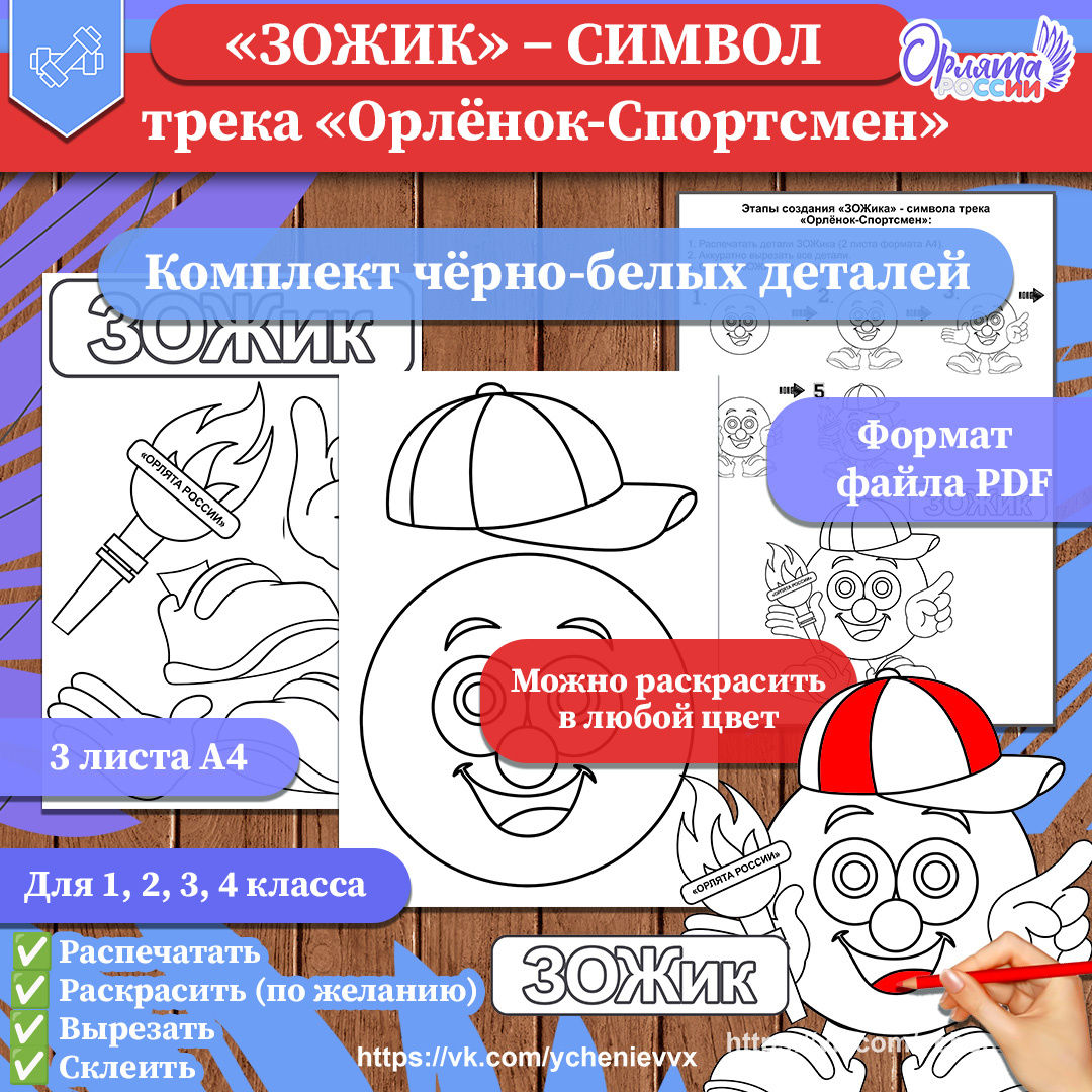 👉 Листы 1–2: чёрно-белые детали для сборки «ЗОЖика» и табличка с надписью «ЗОЖик». На факеле размещена надпись «Орлята России».