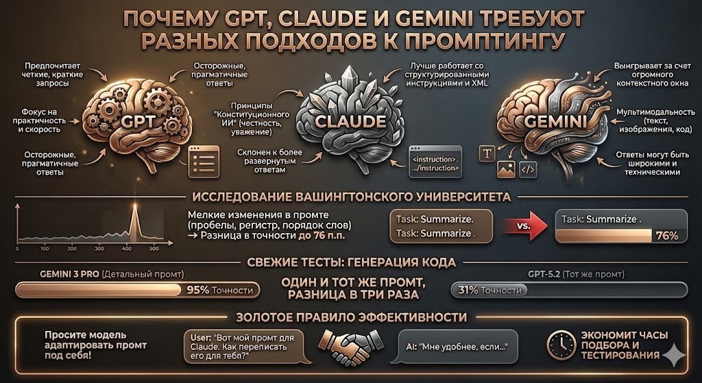 Первые месяцы я писала одинаковые промты для всех моделей. Логично же: задача одна, значит и инструкция должна работать везде. Не работала. Потом наткнулась на исследование из Вашингтонского университета. Ученые проверили, как модели реагируют на мелкие изменения в оформлении промта: пробелы, регистр, порядок слов. Разница в точности доходила до 76 процентных пунктов. Семьдесят шесть. На одной и той же задаче. Причина глубже, чем кажется: ✨ ChatGPT построен на decoder-only архитектуре: он предсказывает следующее слово на основе предыдущих. ✨ Gemini использует encoder-decoder: сначала "понимает" весь запрос целиком, потом генерирует ответ. Это разные способы обработки информации. На практике это означает, что порядок элементов в промте критически важен для одних моделей и почти не влияет на другие. Исследователи из европейских вузов показали, что простое повторение промта улучшает результаты GPT, Claude и Gemini, но по-разному. А в задачах генерации кода Gemini с детальным промтом в