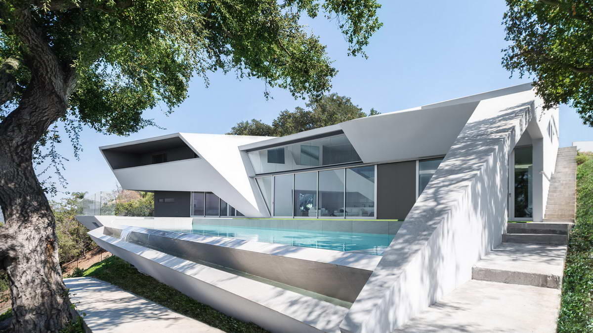 Этот неожиданный и бескомпромиссный модернист скульптурной формы построен в одном из самых дорогих районов Лос-Анджелеса. Сложный участок и ограничение по высоте, чтобы не перекрывать уже сложившиеся виды из расположенных выше домов, студия погрузила дом на 18 футов (5,5 метров) в местность. Резиденция интегрирована в окружающий ландшафт с геометрическим внешним видом, имитирующим местность и хаотичные отклонения естественных скальных образований. Частная зона находится на верхнем этаже, где архитекторы расположили две спальни и кабинет с раздвижной перегородкой, выполняющий также функцию гостевой комнаты — эти помещения находятся на разных концах продольного объема. Сверху же организован вход и устроен гараж. Центр здания занимает парадная лестница, которая ведет к общей зоне двойной высоты. Основные жилые и развлекательные помещения, а также главная спальня расположены на нижнем уровне и выровнены с открытой террасой и пейзажным бассейном. Проект получил награду за дизайн в 2016