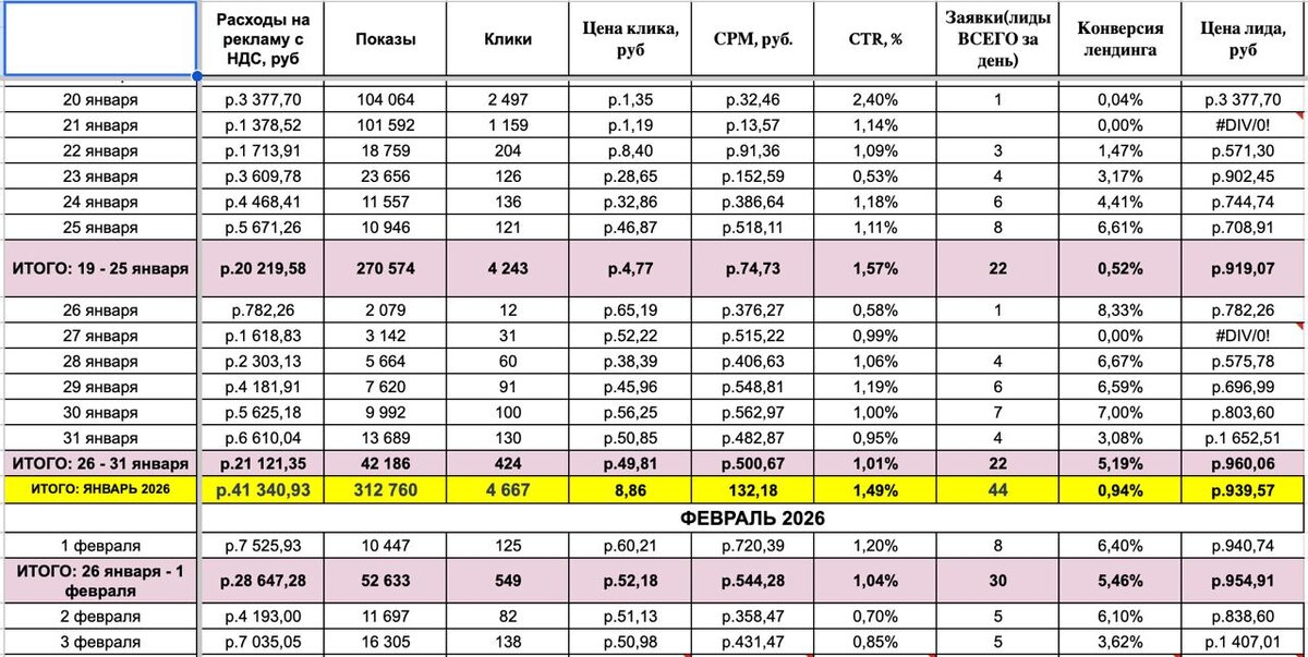 (Разбираю на примере кейса российского производителя оборудования) К нам пришел клиент Карбоксика. Это единственный в России производитель аппаратов для карбокситерапии. Основная аудитория - клиники и салоны красоты. Рынок плотный, конкуренты в основном зарубежные. Запрос классический: увеличить продажи с помощью рекламы. Мы профессионально работаем с B2B и медицинскими нишами, поэтому сразу понимали, как выстраивать систему. Прошло всего 14 дней с запуска трафика, а мы уже вышли на системные результаты. На скринах видно, что заявки качественные и хорошо идут по воронке. У двух клиентов уже полная готовность к покупке, несколько едут на обучение. Это ключевой этап в этой нише. Я не люблю хвастаться ценой лида, для бизнеса это вторичная метрика. Но здесь есть о чем поговорить. В медицине качественный B2B лид обычно стоит от 3 до 5 тысяч рублей. У нас сейчас получается в районе 1200 рублей. За счет чего это сработало? Тут включился мой авторский подход: инженерная логика плюс 30 л