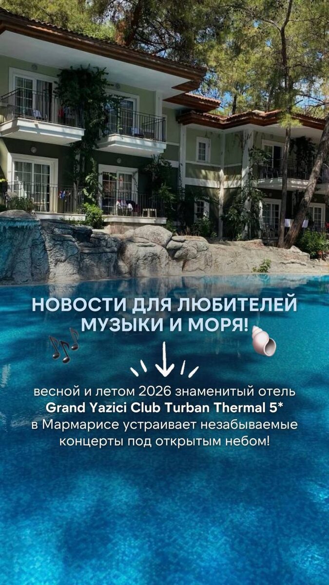 ❗ Этой весной и летом знаменитый отель Grand Yazici Club Turban Thermal 5* в Мармарисе устраивает для своих гостей незабываемые концерты под открытым небом❗ В программе: 🎶 7 мая — живое выступление звезды Марии Краймбрери. 🎶 11 июня — атмосферный концерт обаятельной Ханны. Посещение концертов абсолютно бесплатно для всех гостей, проживающих в отеле 🔥Это ваш уникальный шанс совместить отдых у моря с встречей с любимыми артистами. Классный отель в Мармарисе в окружении сосен на самом берегу Эгейского моря. Здесь рай для детей: игровой парк, мини-футбольное поле, хобби-клуб, мини-амфитеатр, 3 водные горки. 6 Kids Dreamland - место, где дети могут поиграть в любимых персонажей, нарядившись в костюмы и аксессуары героев и сказочных персонажей. Фишка отеля - бассейны с термальной водой: как открытый, так и несколько крытых. Два пирса, на одном из которых проходят дискотеки. ✈️ Вылет из Москвы 6 мая на 7 ночей питание "Ультра все включено" 2 взрослых - 169 900 рублей Оставить заявку