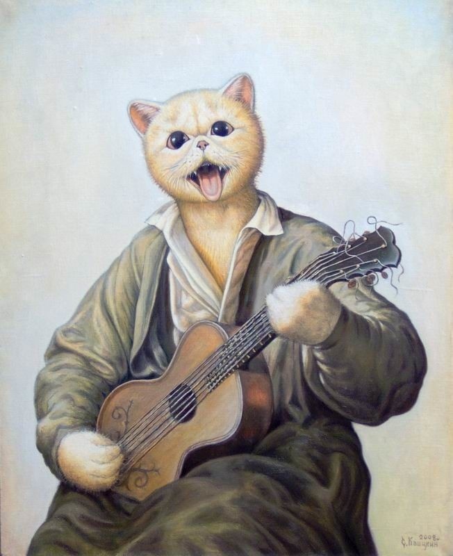 Художник Степан Каширин. "Кот гитарист". (50x40см.) холст, масло. Из проекта «Люди-кошки». Картина находится в частной коллекции в герцогстве Люксембург.