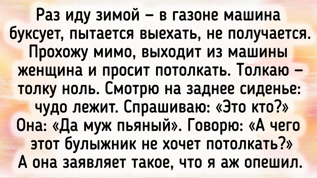 У мужа было: он специалист в своём деле, а предлагали вакансии то грузчика, то охранника. И, главное, нельзя же отказываться, чтобы не сняли с пособия. Следующая вакансия — разнорабочий в школе. Пошёл, там говорят: «Отказывайтесь сами, мы не можем, хотя разнорабочий нам не нужен». На вопрос: «А нафига тогда вакансию размещаете?» — ответ: «Работаем с компанией на аутсорсе (уборщицы, дворники, разнорабочие), но, чтобы перезаключить договор на следующий год, нам нужно доказать, что мы обращались в ЦЗ, но все кандидаты от вакансии отказались». © Эмма Романова / Dzen Пришёл по объявлению на должность кладовщика. Первый вопрос: «По какой статье вы сидели?» Оказалось, контора набирает освобождённых по УДО. Сказал, что могли бы предупредить, и ушёл. © a.darkovsky / Dzen Подхожу к стеклянной двери кафе, хочу зайти. Вижу мужчину — я решила его пропустить, пусть выйдет. Он не выходит, чего-то ждёт. Я открываю дверь, и он выходит в открытую мной дверь. На вид лет на 10 меня моложе выглядит. Что эт