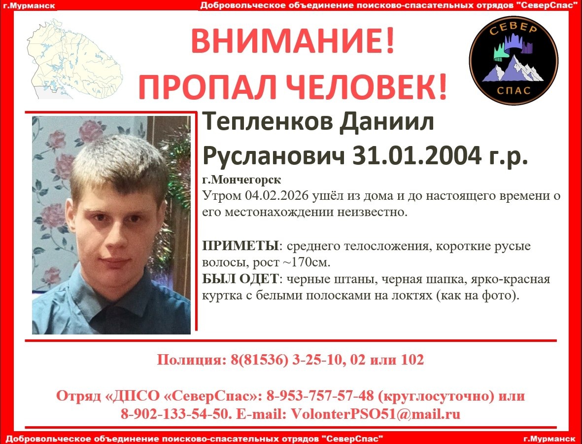 В поисково-спасательном отряде «СевеСпас» сообщают о пропавшем молодом человеке из Мончегорска. 22-летний Даниил Тепленков утром 4 февраля ушел из дома и до настоящего времени его местонахождение неизвестно. Приметы: среднего телосложения, короткие русые волосы, рост - 170см. Был одет в ярко-красную куртку с белыми полосками на рукавах, черные штаны, черную шапку. Может быть в любом городе области. Координатор поиска: Степанида +7 (911) 324-90-20. Связной: Анастасия +7 (911) 328-98-77.