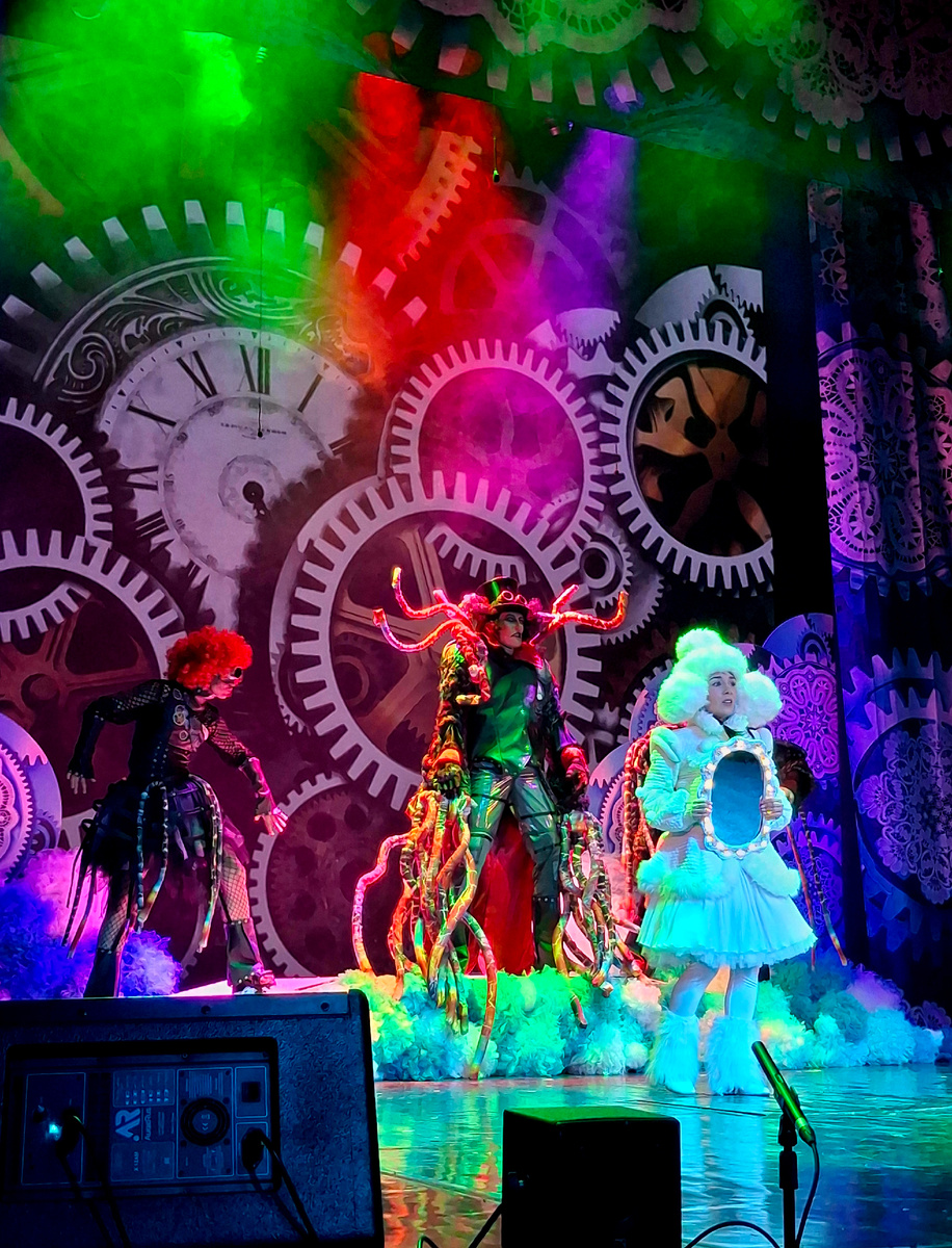 В первую очередь хочу отметить потрясающие костюмы. Волшебник невероятной красоты в цилиндре и шикарной шубе, всё расшито сияющими узорами, будто Дед Мороз.
