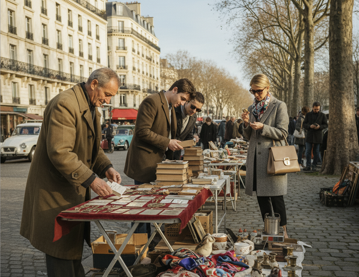 Воскресное утро, 7:30. Я стою с кофе среди сотен столов, заваленных чужими жизнями. Рядом пожилой француз с увеличительным стеклом изучает механизм карманных часов, а девушка в винтажном пальто перебирает стопку писем 1930-х годов.