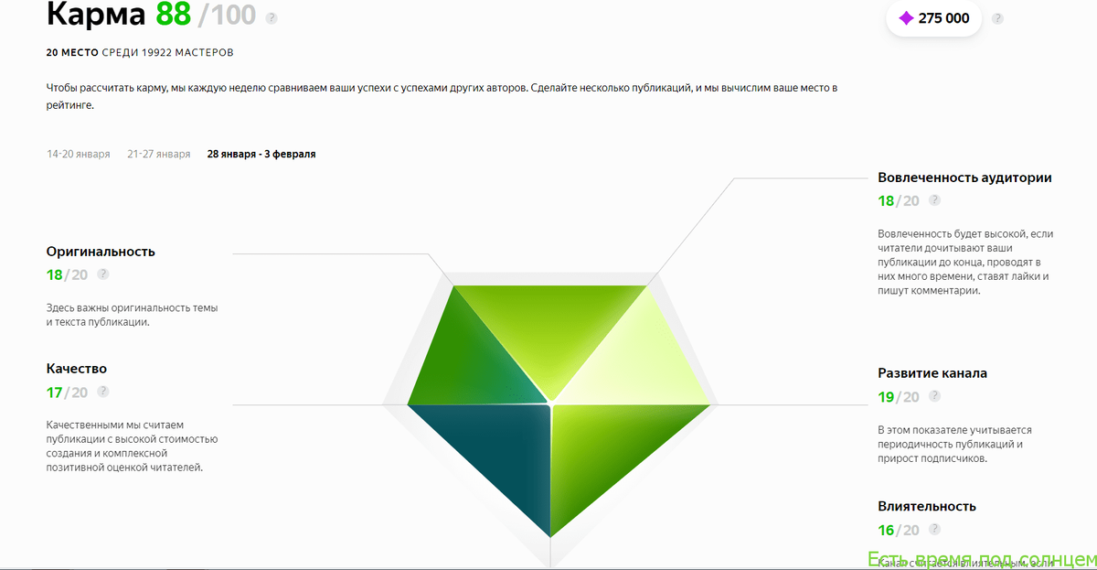 Как там в песенке? «Я оглянулся посмотреть — не оглянулась ли она…» Но зато красивая Карма осталась мне на память. Не умею пока этим каналом в Телеграмм пользоваться, но научусь. Заранее извиняюсь, если не смогу пока сразу всем отвечать, но комментарии уже вижу. И даже смогла привязать чат для обсуждений к своему каналу. Как говорится: «Всё, что ни делается — к лучшему», да и случайно (само) ничего не делается. Значит — так и должно было случиться. Просто всё произошло слишком внезапно. Хотя это не в первый же раз. И моего увольнения ни сейчас, ни тогда (в 2019-м) ничего не предвещало. Вот, посмотрите сами, какая у меня была ПОСЛЕДЯЯ Карма: Карма определяла канал и его место среди остальных авторов площадки. И на последней неделе перед моим первым уходом, было точно также, только мне ещё добавили 50 000 бонусных показов. А теперь представьте себе, что же должен такого страшного натворить автор, чтобы его вот так резко понизили: Потому что их не было. Да и не считается яркий заголовок с