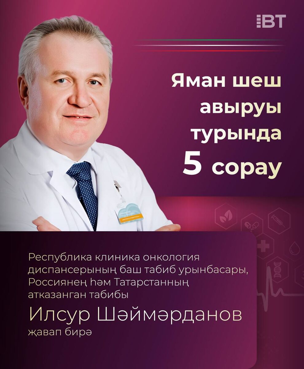Республика клиника онкология диспансерының баш табиб урынбасары, Россиянең һәм Татарстанның атказанган табибы Илсур Шәймәрданов җавап бирә Әңгәмәнең тулы варианты 👇 https://vatantat.ru/news/rkodnyn-bas-tabiby-urynbasary-ilsur-saimardanov-koras-uzenne-iaratudan-baslana-111812