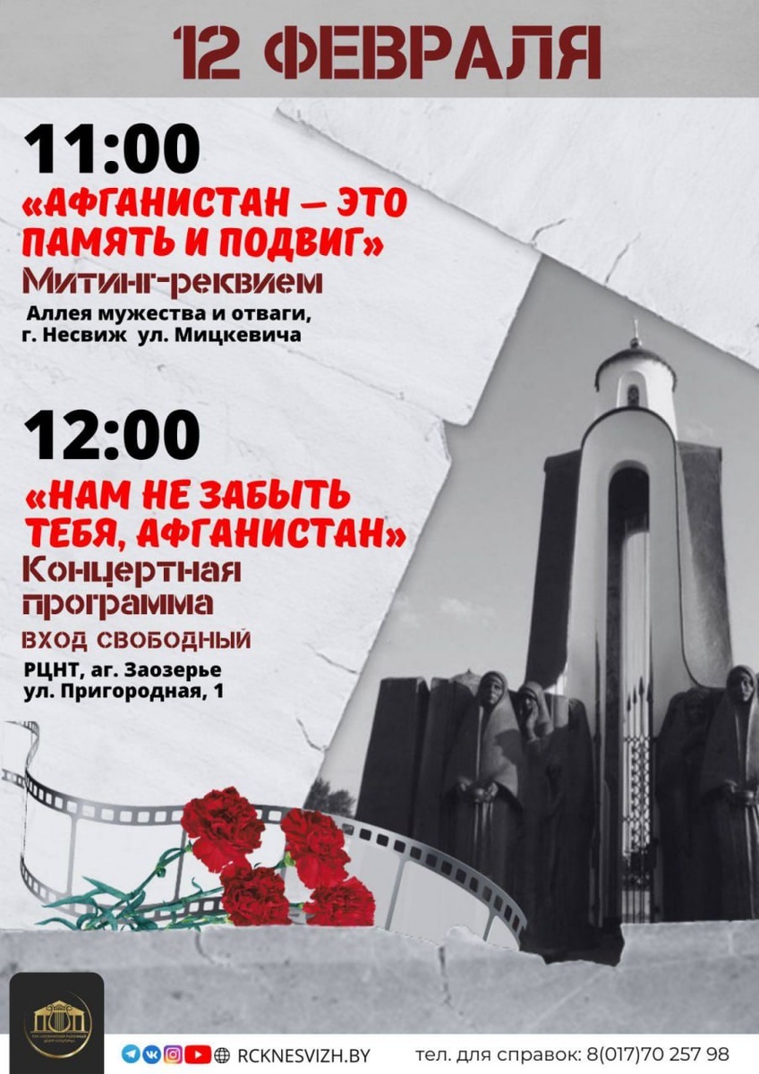 Районное мероприятие памяти участников Афганской войны. • 11:00 — митинг‑реквием «АФГАНИСТАН — ЭТО ПАМЯТЬ И ПОДВИГ» на Аллее мужества и отваги (г. Несвиж, ул. Мицкевича). Минута молчания, возложение цветов, слова благодарности ветеранам. • 12:00 — концертная программа «НАМ НЕ ЗАБЫТЬ ТЕБЯ, АФГАНИСТАН» в РЦНТ (аг. Заозерье, ул. Пригородная, д. 1). В программе — музыкальные и поэтические номера в память о погибших и в знак уважения к ветеранам. ВХОД СВОБОДНЫЙ. Присоединяйтесь, чтобы вместе почтить память и поддержать тех, кто прошёл через войну.