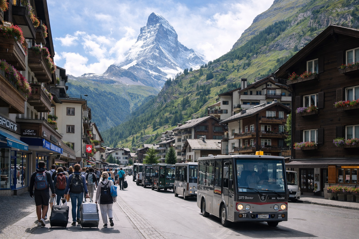 Зимой в Церматте резко возрастает количество служебных рейсов. Отели запускают дополнительные шаттлы, логистика становится плотнее, а расписания — жёстче. Ошибки в координации сразу вылезают наружу: задержки поездов, перегруженные платформы, очереди на трансферы.