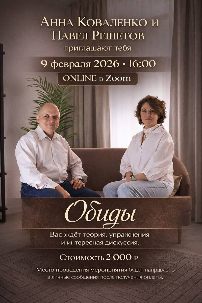! Так что теперь смогут поучаствовать даже люди с Владивостока! Срок формирования группы - до вечера воскресенья. Тренинг состоится при наборе от 4-х человек, так как планируется работа по комнатам в ZOOM. В случае если 4-х желающих не будет - возможен возврат денежных средств или перенос даты. Формат встречи Онлайн Оплату 2 000,00 рублей за тренинг длительностью 2часа необходимо сделать до 22:00 воскресенья 08.02.2026, так Вы фиксируете место за собой. Можно произвести следующими способами: - По номеру телефона +7 903 125 8484 Сбербанк, Альфа-Банк. - По номеру карты Точка Банк 2204 4502 5009 1219 После оплаты прошу направить чек в личные сообщения @Any_Kovalenko в ответ я направлю чек из налоговой и ссылку для подключения к встрече. Оплата из Европы возможна, напишите в личные сообщения, также направлю ссылку