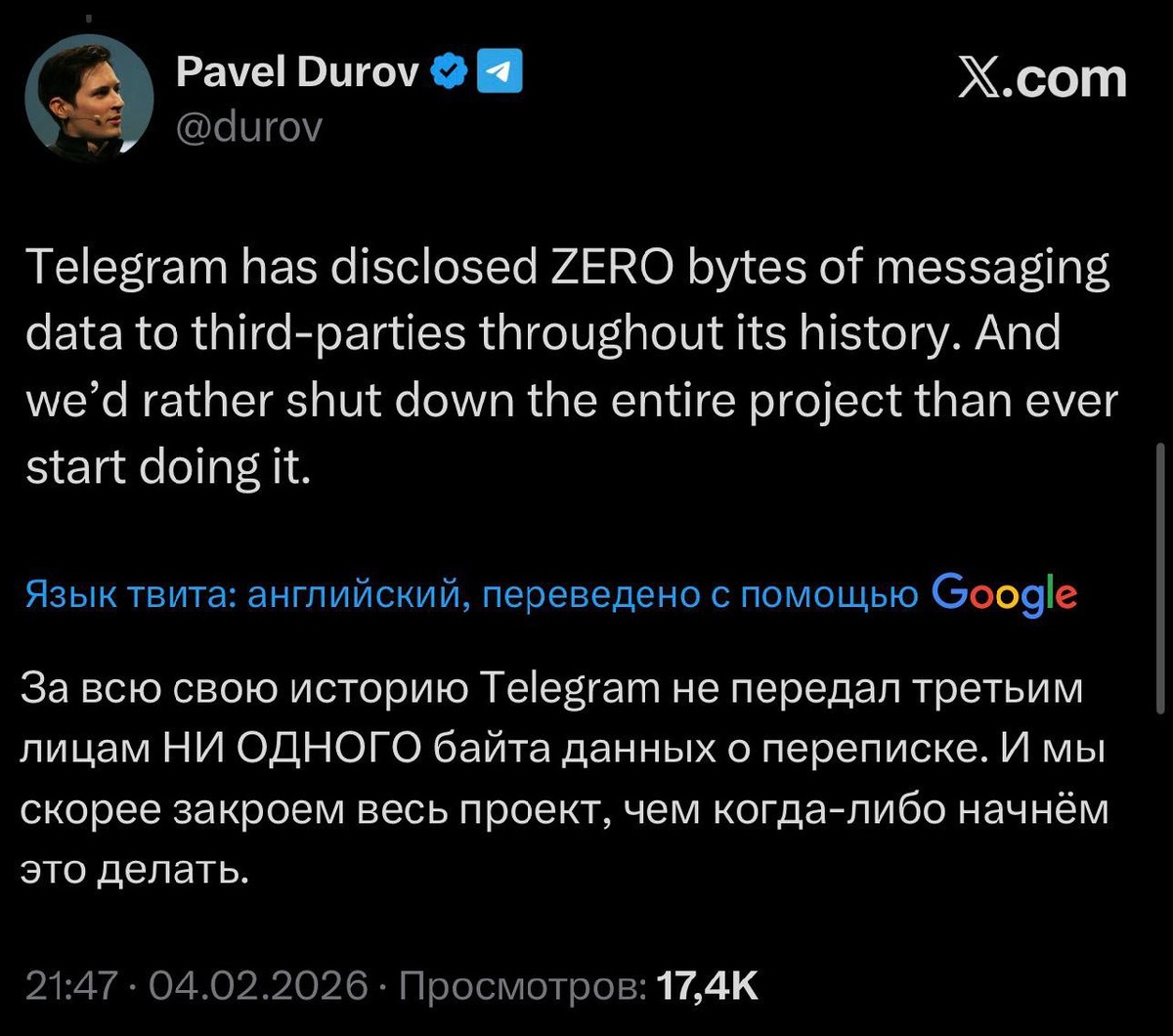 Павел Дуров сообщил, что способен отключить серверы Telegram быстрее, чем Роскомнадзор сможет ограничить доступ к мессенджеру. По его словам, Telegram никогда не передавал третьим лицам данные переписки пользователей. — «Мы скорее закроем весь проект, чем начнем это делать». https://dzen.ru/id/5c0e38ff46ef5c00aaa80527