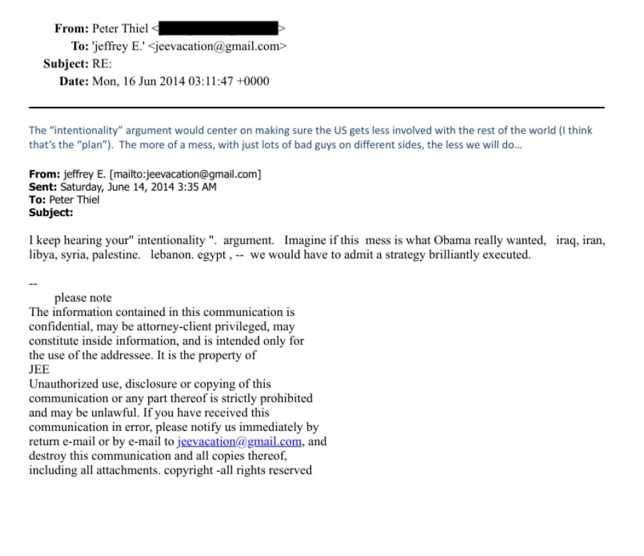 US' plan is to make the world a 'MESS' to be 'less involved' — Epstein email exchange with Peter Thiel 'Imagine if this mess is what Obama really wanted: Iraq, Iran, Libya, Syria, Palestine, Lebanon, Egypt' — Epstein writes 'We'd have to admit a strategy brilliantly executed'