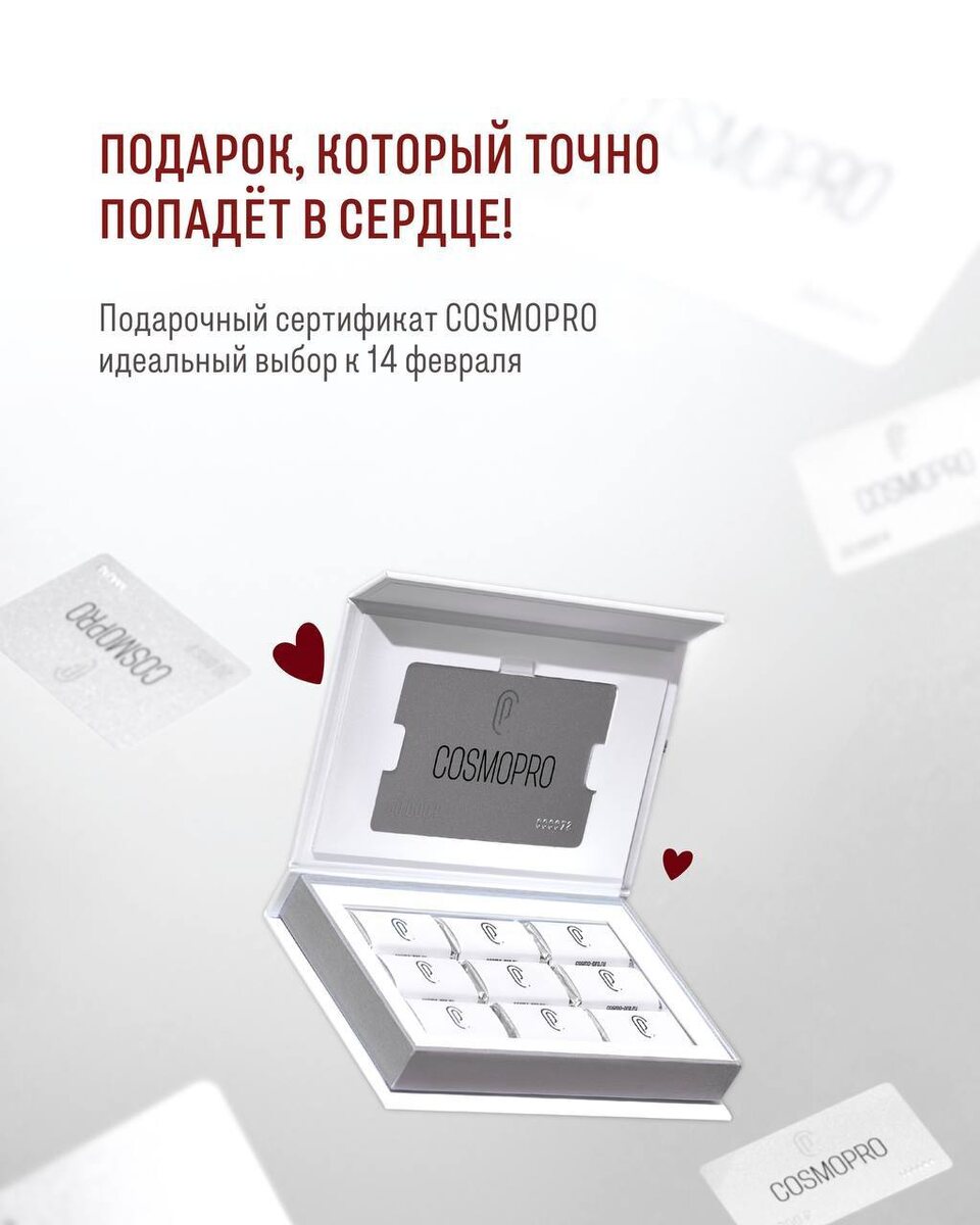 Любовь — это забота о себе. И о тех, кого ты правда ценишь. Пока все ломают голову, что подарить на 14 февраля, мы предлагаем подарок без риска, лишних догадок и «ну… спасибо». 🎁 Подарочный сертификат в клинику COSMOPRO — это про внимание, уверенность и ощущение «обо мне подумали». Для неё. Для него. Для себя. На первое свидание с собой или как знак любви без лишних слов. В День всех влюблённых дарят сердца. Мы — дарим сияние, уверенность и удовольствие от отражения в зеркале ✨ Уточнить номиналы и условия сертификатов можно по ссылке 🔗