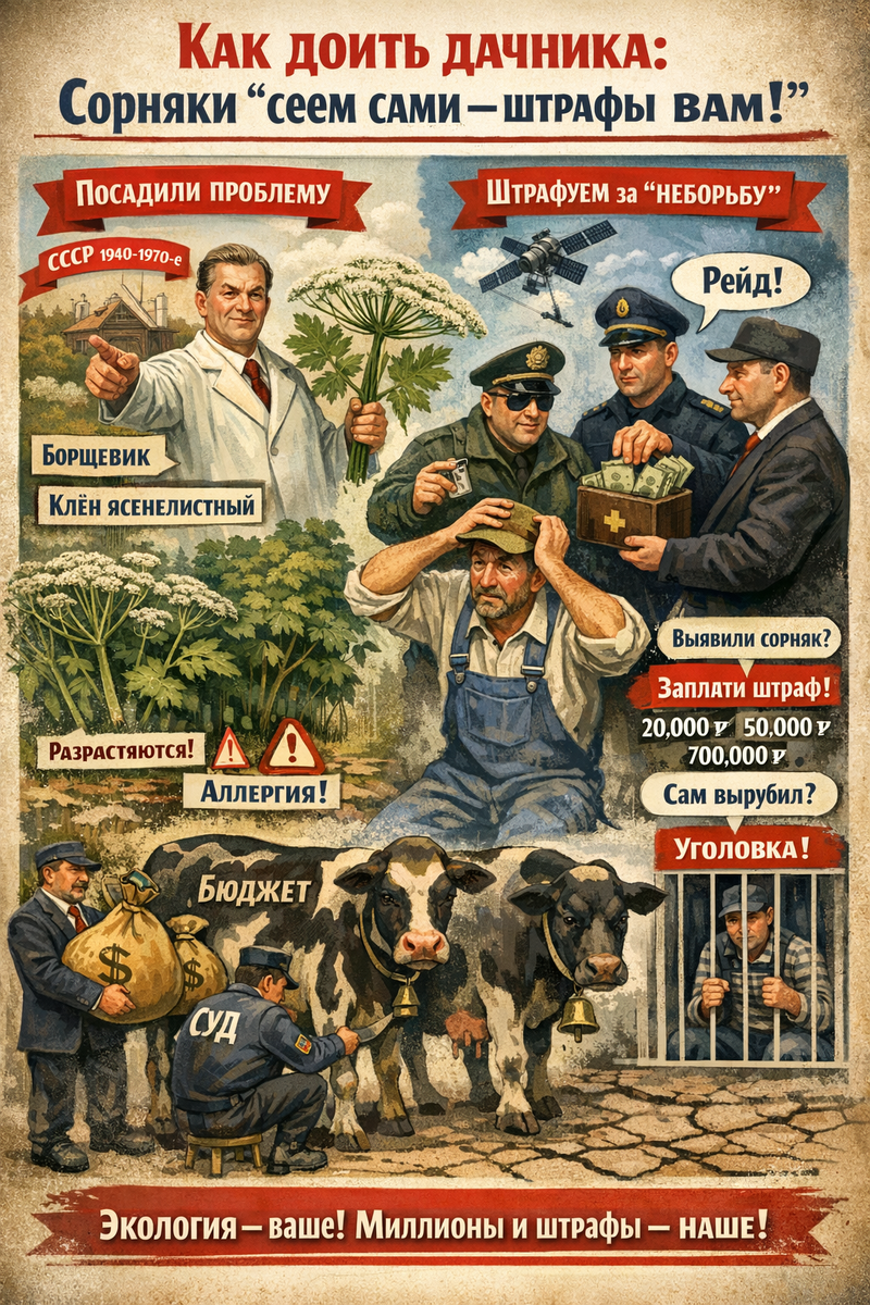 Теперь парадокс: государство переложило вину на нас! С 1 марта 2026-го (ФЗ №294) все собственники земли ОБЯЗАНЫ выявлять и уничтожать борщевик за свой счёт — химией, корчеванием или биометодами. Не сделаешь? Штрафы по ст. 8.7 КоАП: физлицам 20-50 тыс. руб., юрлицам до 700 тыс. руб. В регионах (Москва, Подмосковье, Владимирская обл.) уже местные штрафы от 5 тыс. до 1 млн руб., плюс изъятие земли, если заросли >50% участка.
