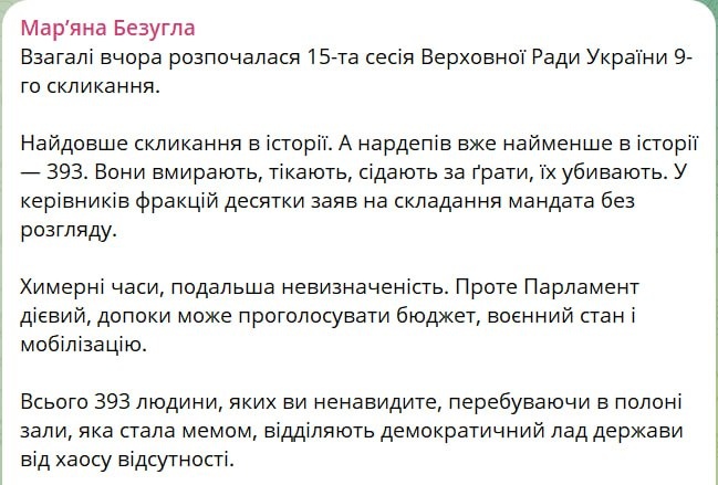 😄 У руководителей фракций Рады лежат без рассмотрения десятки заявлений на сложение мандатов, сообщила нардепка Марьнка Безуглая. Она напомнила, что в Раде осталось 393 депутата. Подписаться на наш канал 👈 Мы в ВК / Мы в ОК✨ Подписаться на наш чат 💬 Обратная связь 🗣