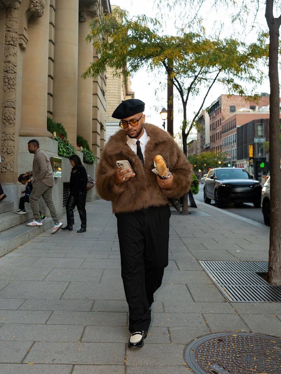 🤍Главный герой здесь — меховая куртка. 🤍Образ поддержан чёткой, почти деловой базой — белая рубашка, галстук, прямые чёрные брюки. 🤍Берет и очки добавляют интеллектуального шарма и лёгкой французской иронии. 🤍Обувь — лаконичная, на плоском ходу — удерживает баланс Мне здесь особенно нравится ощущение непринуждённости: человек идёт по своим делам, с кофе и телефоном, но выглядит так, будто всё продумано до мелочей. Ссылки на альтернативный образ тут👇 Шуба Рубашка Брюки Обувь Головной убор Галстук Очки