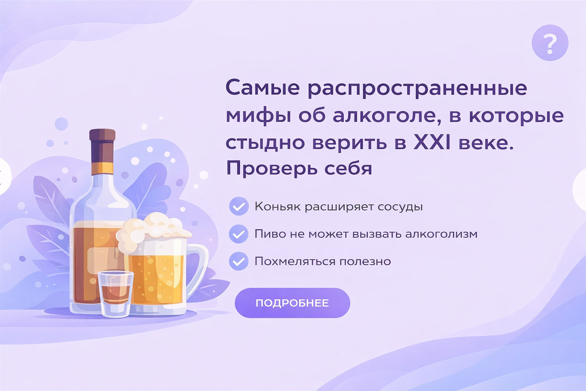 «Да ты что, коньяк же для сосудов полезен», «Пиво - это вообще не алкоголь», «Надо похмелиться, иначе хуже будет». Эти фразы произносятся с таким видом, будто их только что подтвердили в лаборатории Гарварда. Причина живучести этих мифов простая и неудобная: они оправдывают. С ними не нужно задавать лишних вопросов, не нужно менять привычки и признавать, что контроль давно стал иллюзией. Гораздо комфортнее верить, что проблема где-то «у других», а ты просто знаешь меру. Алкогольные мифы - это коллективный самообман, в котором участвуют миллионы людей. И чем чаще их повторяют, тем правдоподобнее они кажутся. Миф №1: «Коньяк расширяет сосуды и полезен для сердца» Любимый аргумент «солидных» застолий. Да, алкоголь действительно вызывает кратковременное расширение сосуд