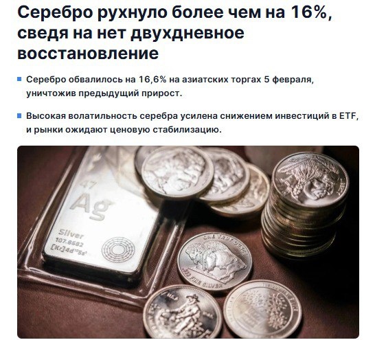 Новый обвал уничтожил прирост, достигнутый в результате восстановления цен в течение двух предыдущих дней. «Золото на стероидах» сохраняет высокую волатильность, пытаясь нащупать ценовое дно после исторического обрушения рынка. В начале азиатских торгов спотовая цена серебра ненадолго поднялась выше $90 за тройскую унцию, но затем рухнула на 16,6%, до $73,6. Спотовое золото в ходе волатильных торгов упало на 3,5%, до $4792 за унцию. Впоследствии котировки двух ключевых драгметаллов немного скорректировались вверх, но не вышли из красной зоны. В январе драгоценные металлы взлетели в цене в ходе ралли, подкрепленного спекулятивным импульсом, геополитическими потрясениями и опасениями по поводу того, что ФРС США может утратить независимость от Белого дома. Этот стремительный рост резко оборвался в конце прошлой недели: 30 января серебро пережило крупнейший обвал в истории, а падение цен на золото стало самым резким с 2013 года. Стратег по рынку биржевых товаров ING Эва Мантей отметила,