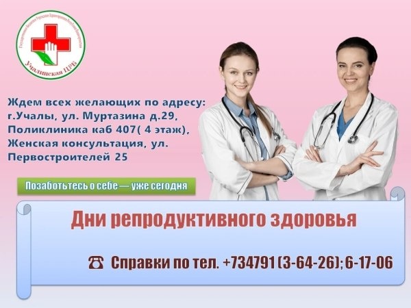 Позаботьтесь о себе уже сегодня! Дорогие женщины! Приглашаем ВАС позаботиться о своем здоровье и принять участие в акции «Неделя репродуктивного здоровья», которая проходит каждую первую неделю месяца (с 02 по 07 февраля). Кто может пройти обследование? Женщины в возрасте от 18 до 49 лет. Ждем всех желающих по адресу: г.Учалы, ул. Муртазина д.29, Поликлиника каб 407( 4 этаж) , Женская консультация, ул. Первостроителей 25. Справки по тел. +734791 (3-64-26); 6-17-06, Обследование проходит в 2 этапа: 1 этап Базовый скрининг (обязателен для всех): Приём у акушера-гинеколога Осмотр и пальпация молочных желёз Осмотр шейки матки + мазок Микроскопия и цитология Для женщин 1829 лет: ПЦР-тесты на инфекции (хламидии, микоплазмы и др.) 2 этап Дополнительные исследования (по показаниям): ПЦР-тесты (для женщин 3049 лет) УЗИ органов малого таза УЗИ молочных желёз Повторный приём гинеколога… https://uchaly102.ru/?p=123566