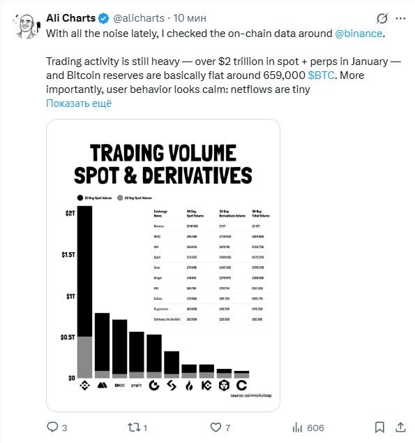 Торговая активность по-прежнему высокая — в январе более $2 трлн на споте и перпетуалах, а резервы биткоина фактически без изменений - около 659 000 BTC. Что ещё важнее, поведение пользователей выглядит спокойным: чистые потоки средств мизерны по отношению к общим резервам и даже близко не напоминают уровни стресса, которые бывают при настоящей панике. Обычно это говорит об одном: ликвидность есть, и пользователи не бегут к выходу. Когда рынки трясёт, именно так и выглядит реальная стабильность.