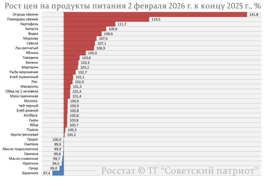 Поговорим о хлебе насущном, а точнее о росте цен на продукты питания, показавшим бодрый старт в начале года (в связи с повышением НДС), но теперь предсказуемо замедлившим свой рост. В связи с этим интересно будет взглянуть на базовые продукты и как они выросли за месяц с конца декабря прошлого года: Судя по диаграмме, сделанной мной по данным Росстата, лидерами роста остаются картофель и овощи из так называемого борщевого набора. А также водка (повышен акциз), говядина, рыба мороженная и неожиданно вырос в цене маргарин. Но ситуация с картошкой и овощами выглядит не столь драматичной, если сравнить цены начала февраля 2026 г. с началом февраля 2025-го года: Тут они показывают снижение цен. Чего нельзя сказать про говядину, рыбу, хлеб и опять таки маргарин. Что там случилось с этим маргарином, я даже не знаю. Не иначе россияне разбогатели так, что пошли дружно скупать маргарин. Ведь так нам объясняла российская знать все прошлые повышения цен, начиная с яиц и заканчивая сливочным маслом