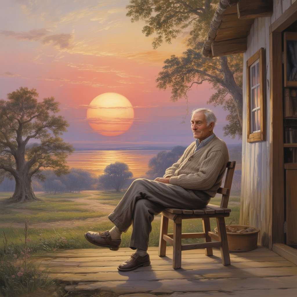 Старый дед Григорий сидел на крыльце своего домика, глядя на закат. Солнце, словно огромный алый шарик, медленно опускалось за горизонт, окрашивая небо в нежные розовые и золотистые тона. В воздухе витала тишина, нарушаемая лишь легким шелестом листьев на ветру. Григорий вздохнул, вспоминая свою долгую жизнь. Сколько всего он пережил: радости и печали, победы и поражения, любовь и утраты. Но сквозь все это неизменно светила одна вещь – свет жизни. Он вспоминал свою юность, полную энергии и азарта. Как он бегал босиком по лугам, лазал на высокие деревья, мечтая о великих свершениях. Он вспоминал свою любимую жену, Анну, с её добрыми глазами и мягкой улыбкой. Она была его светом, его опорой и вдохновением. Были и трудные времена – война, голод, потеря близких. Но даже в самые чёрные дни Григорий не терял веры. Он знал, что свет жизни всегда есть, нужно только уметь его увидеть. Сейчас, сидя на крыльце своего домика, он чувствовал спокойствие и умиротворение. Жизнь была прожита, и он мог