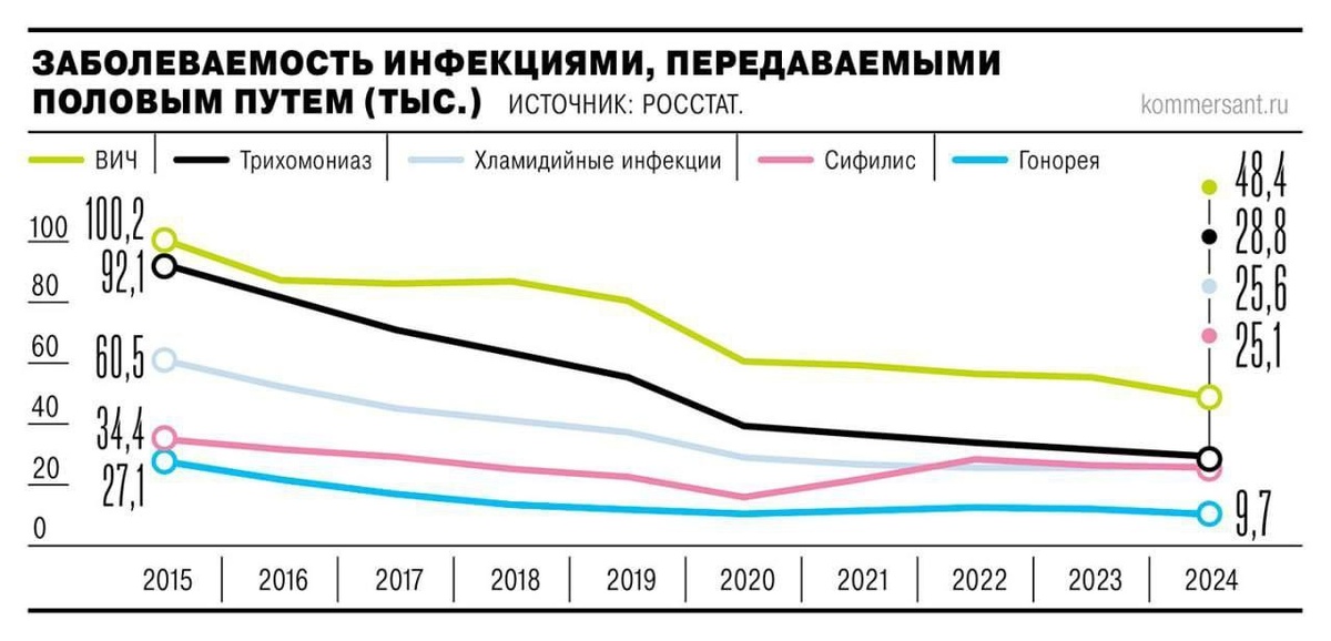 Новые данные Росстата, опубликованные «Коммерсантом», показывают резкий рост заболеваемости сифилисом в России за последние годы. Главные цифры: ➡️ За 4 года (с 2020 по 2024) заболеваемость выросла на 63%. ➡️ В 2020 году: 15,3 тыс. случаев. ➡️ В 2024 году: 25,1 тыс. случаев. Особенно уязвимая группа: Наибольший рост наблюдается среди мужчин старше 40 лет. Здесь показатель более чем удвоился: с 4,7 тыс. (2020) до 9,7 тыс. случаев (2024). Парадокс на общем фоне: Эта негативная динамика контрастирует с общей ситуацией по инфекциям, передаваемым половым путем (ИППП), которая с 2015 года устойчиво улучшается: ✅ Трихомониаз: -69% ✅ Гонорея: -64% ✅ Хламидиоз: -58% ✅ Новые случаи ВИЧ: сокращение более чем вдвое (со 100,2 тыс. до 48,4 тыс.) Что говорят эксперты? В профильном научном центре Минздрава заявляют, что в 2025 году негативный тренд по сифилису был переломлен. Однако медики и эксперты единодушно призывают не ослаблять внимание и напоминают об основах профилактики. Важный вывод: Ци