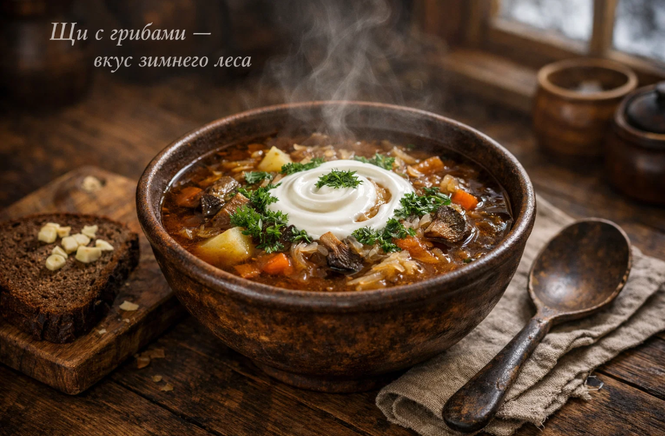 Когда за окном февральская серость, а до весны ещё далеко, тарелка горячих щей с грибами действует лучше любого антидепрессанта. Густой пар над тёмным бульоном, белый островок сметаны, россыпь укропа, кусок чёрного хлеба рядом — что ещё нужно для счастья в обычный будний день.