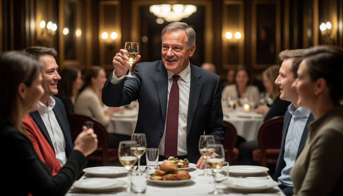 Когда пришло время тостов, Владимир звонко стукнул ножом о бокал. Зал затих.