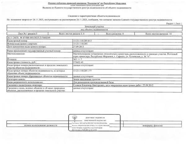 м., кад. № 13:23:1101205:812, категория земель: земли населённых пунктов, вилы разрешённого использования: для размещения производственной базы, принадлежит должнику ООО «ВИТАЛ», ИНН 1327158284. Сведениями о фактическом состоянии объекта недвижимости организатор торгов не располагает. Техническая документация на объект недвижимости и его фотографии отсутствуют у организатора торгов. Канал: Госземля Республика Мордовия Область: Респ Мордовия установлено относительно ориентира Район: расположенного в границах участка. Почтовый адрес ориентира: г. Саранск Населенный пункт: ул. Рузаевская, д. 36-А Локация: Смотреть на карте ВРИ: Иной вид Кадастровый номер: 13:23:1101205:812 Кадастровая стоимость: - Вид сделки: Продажа Площадь: 365 м² Начальная цена: 1093015.00 руб. Дата завершения: 04.03.2026 Подробнее: ГИС ТОРГИ #госземля #земляотгосударства #земля #земельныйучасток #земельныеторги #торги #аукцион #продажаземли #продажа #республикамордовия