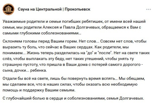 На странице печально известной сауны "Центральная" на ул.Кубанской появилось сообщение, в котором родные владельцев выражают соболезнования семьям погибших в пожаре подростков.