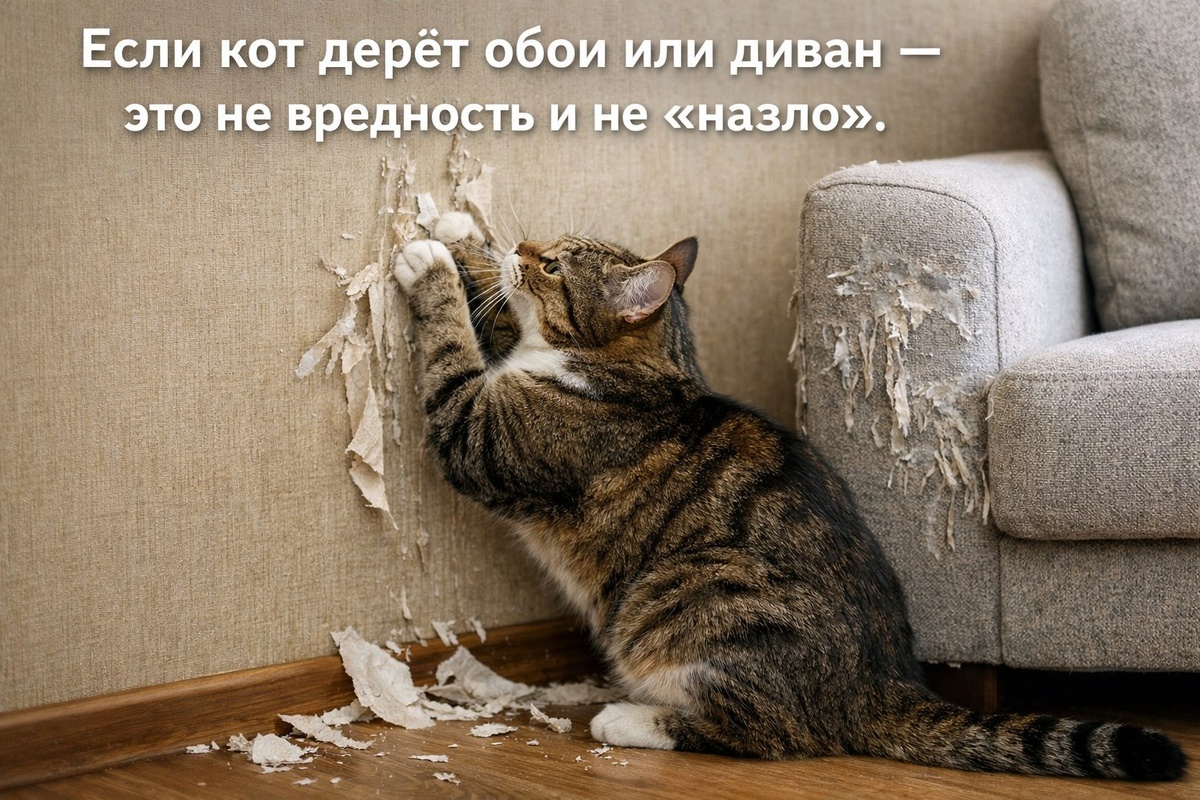 Если ваш кот дерёт обои или царапает диван — не спешите обвинять его в вредности или упрямстве. Это естественное поведение, заложенное природой! Кошки точат когти не просто так: это помогает им метить территорию своим запахом, снимать стресс и поддерживать когти в хорошем состоянии. Когда кот царапает мебель, он словно говорит: «Это моё место». Поэтому ругать питомца бесполезно — гораздо эффективнее направить его энергию в нужное русло. Почему кот выбирает именно диван или обои? Вот несколько причин: - Там удобно тянуться и выгибать спину. - Поверхность хорошо цепляется когтями. - Часто на мебели остаётся запах хозяина — это привлекает. - Коты любят «углы» и проходные места, где можно наблюдать за происходящим. Что же делать, чтобы сохранить мебель и при этом не обидеть питомца? 1. **Правильно поставьте когтеточку.** Она должна находиться рядом с тем местом, которое кот любит царапать — у дивана, возле стены или у входа в комнату. Если кот дерёт вертикально — нужна вертикальная когтет