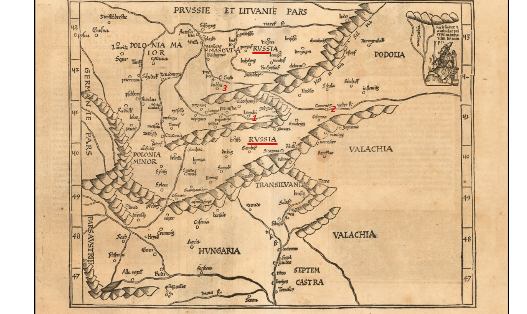 На карте, опубликованной в Страсбурге в 1525 году, можно очень внимательно разглядеть все топонимы. Специально подчеркнут красным – Россия.
