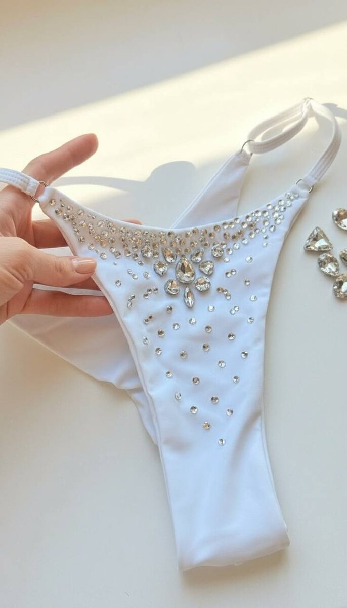 … Вероятно, я никогда их не надену. Но похвастаться хочу 😍😍😍 Параллельно тестирую примерку через ИИ, кажется, не плохо! Я не умею шить, но клеить стразы мне однозначно, нравится! Поэтому, если кому-то очень надо, я могу взять на заказ трусики или лиф. Оплата - за материал, отзыв о носке изделия